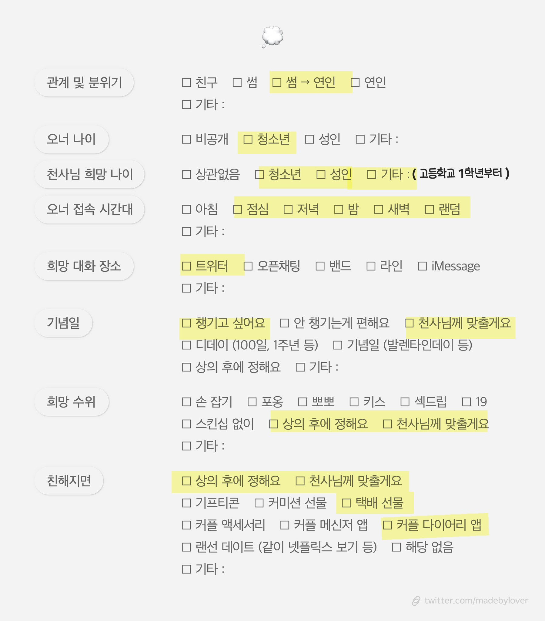• 천사님들끼리 페어 말하지 않고 맺는걸 싫어합니다.만약 페어를 맺고싶으시다면 뒷주방이나,개인 카톡을 이용해주세요!
